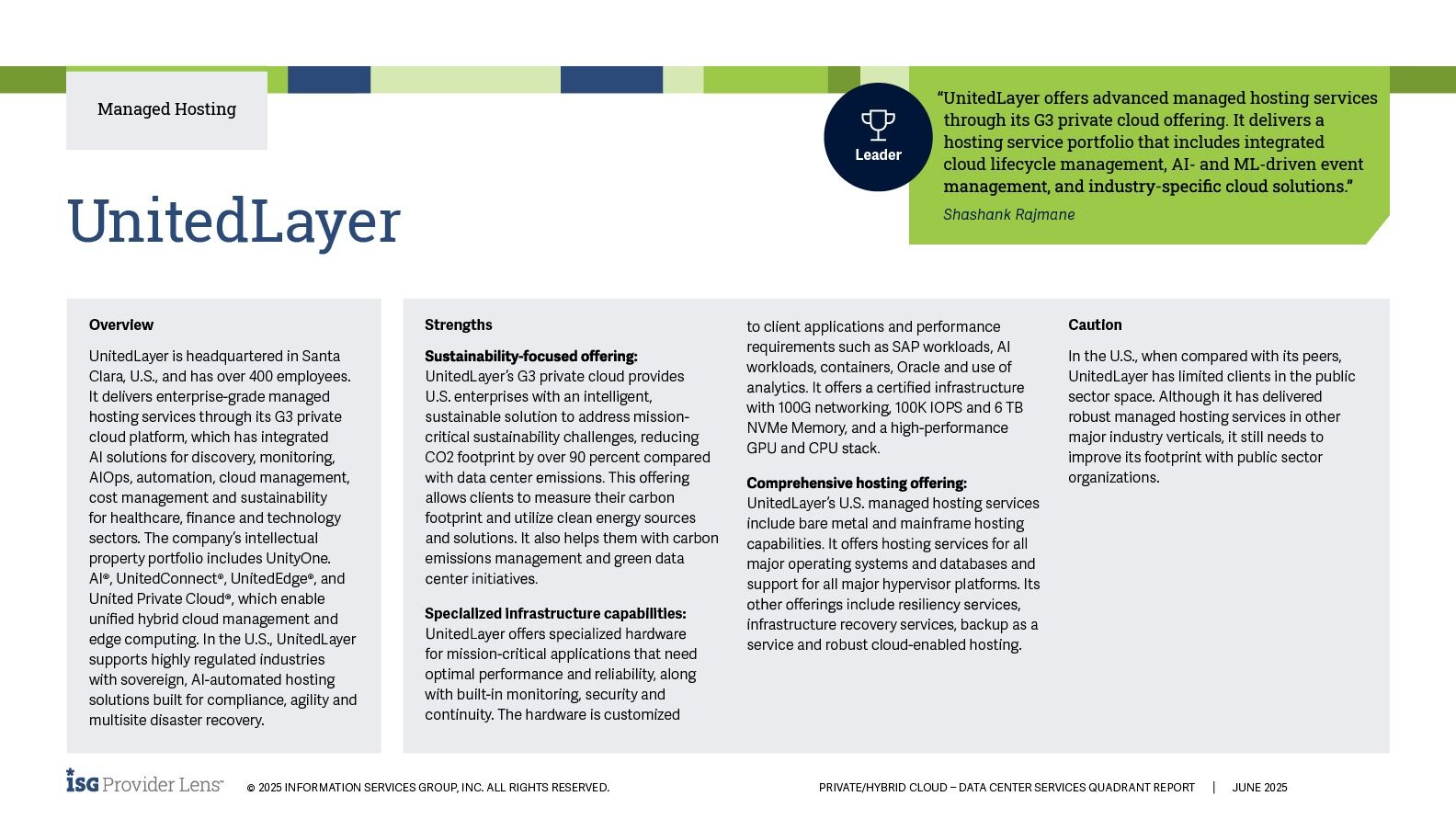 "UnitedLayer is a leading private cloud hosting solution provider with built-in AI-driven cloud intelligence and multicloud management capabilities, that delivers enterprise-grade private cloud infrastructure with high availability, performance, and low-latency networking at a global scale. It offers a premium, high-performance private cloud solution which is a key differentiator, particularly appealing to enterprises with demanding workloads, security and compliance requirements, along with strict uptime requirements."- Shashank Rajmane, Principal Analyst, ISG.