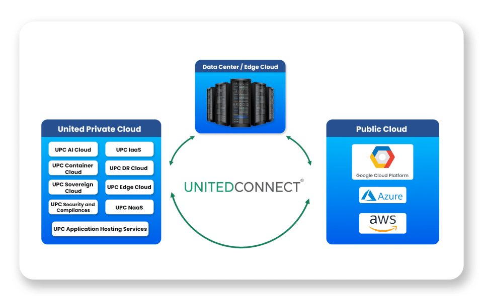 Ensure secure data transfer, optimized application performance, and seamless hybrid cloud connectivity with UnitedConnect®. We deliver high-speed, secure, and reliable network connectivity, enabling businesses to seamlessly integrate on-premises, private cloud, public cloud, and edge environments.