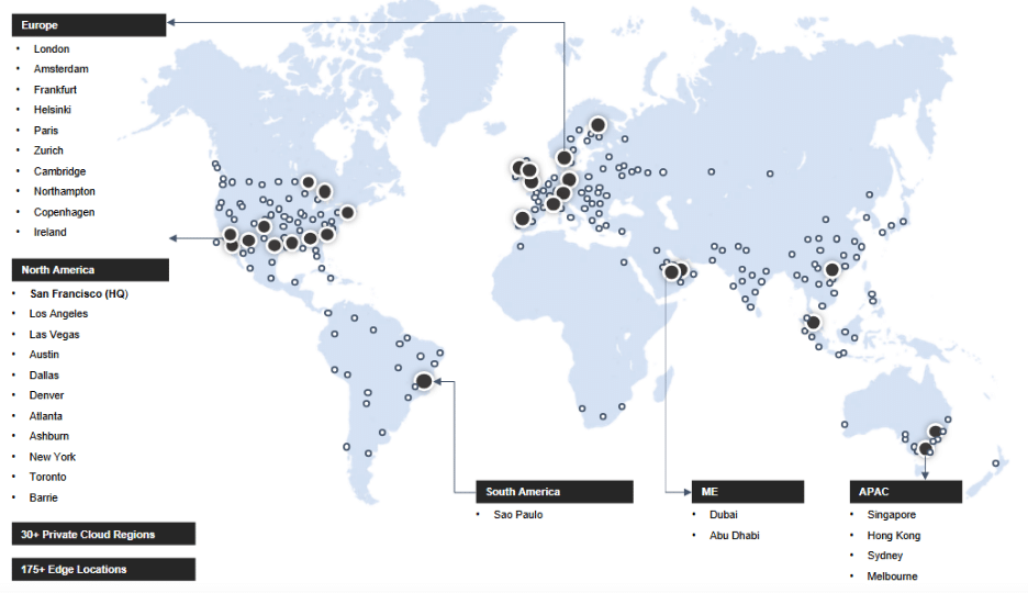 30+ private cloud regions and 175+ edge locations in five continents, bringing cloud computing closer to enterprises and aligning with local sovereignty laws.